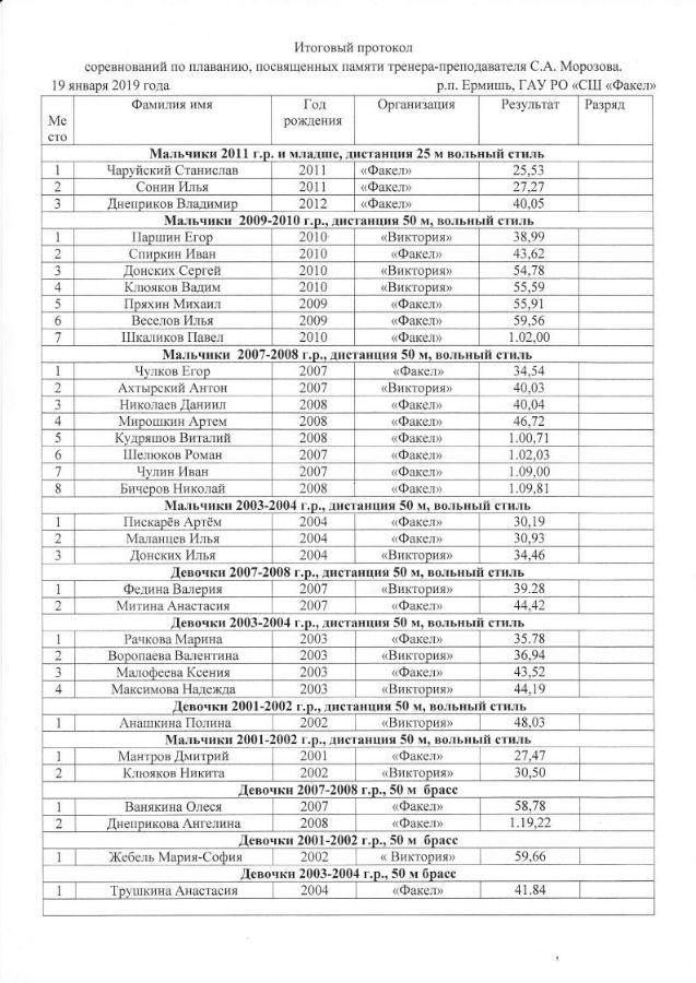 19 января 2019 года в ГАУ РО «СШ «Факел» прошли соревнования по плаванию, посвященные памяти тренера-преподавателя С.А. Морозова. На церемонии открытия соревнований, все собравшиеся почтили минутой молчания память тренера-преподавателя С.А. Морозова. Со словами сожаления о безвременной утрате и воспоминаниями о жизни и вкладе в развитие плавания в нашем районе выступил друг детства Бобров А.И..