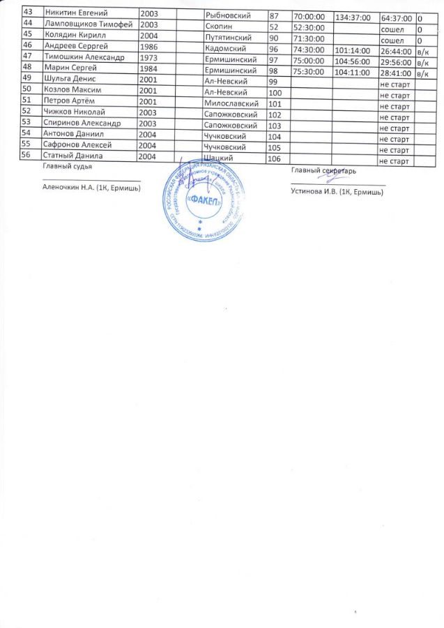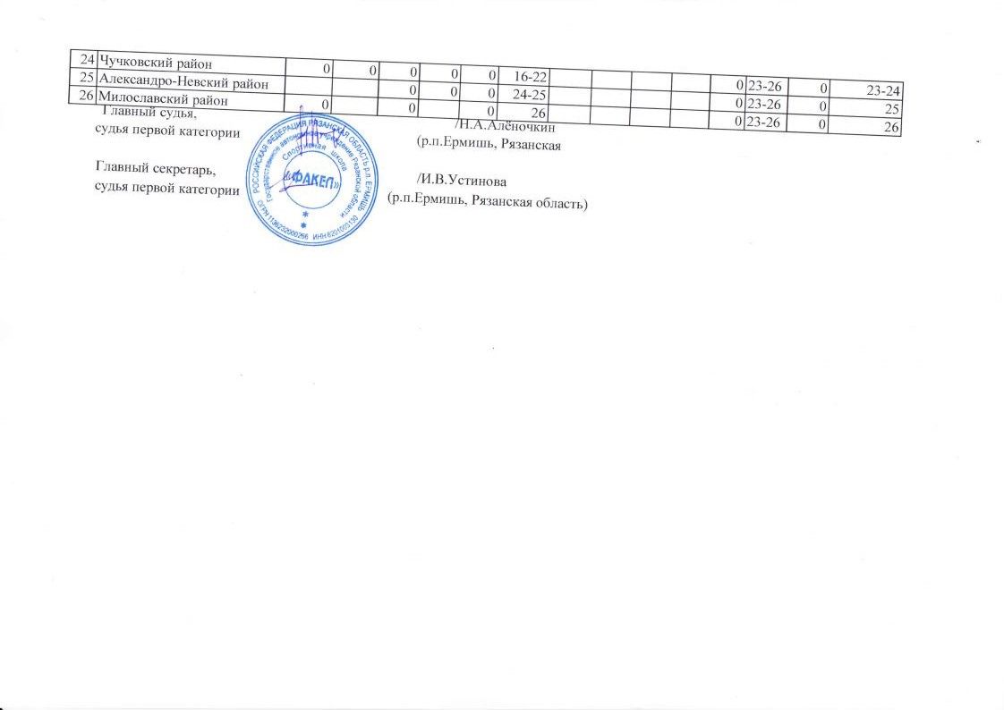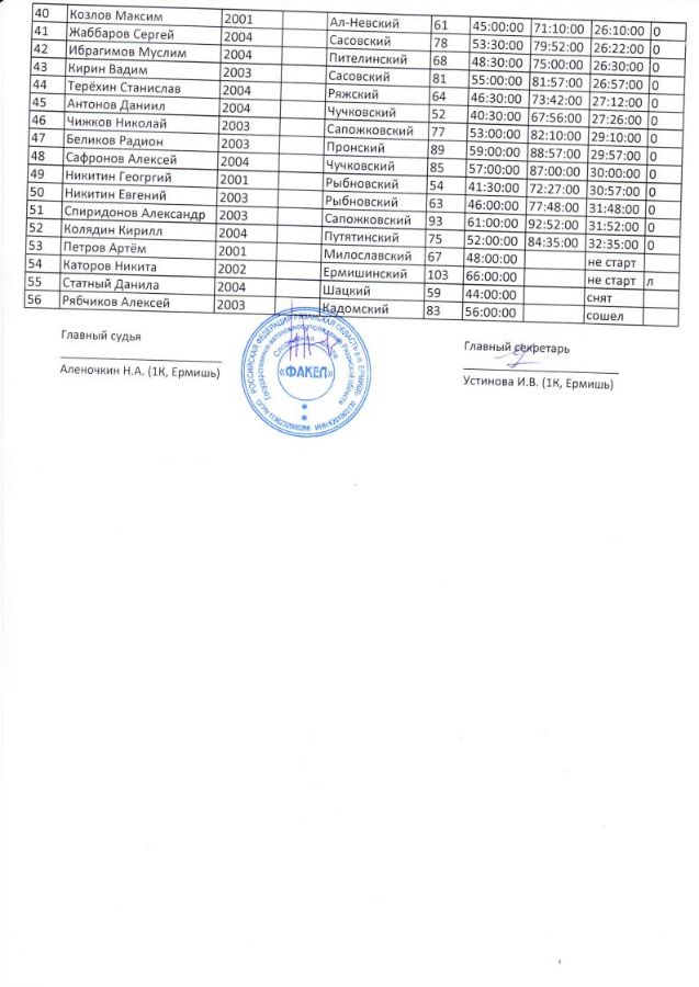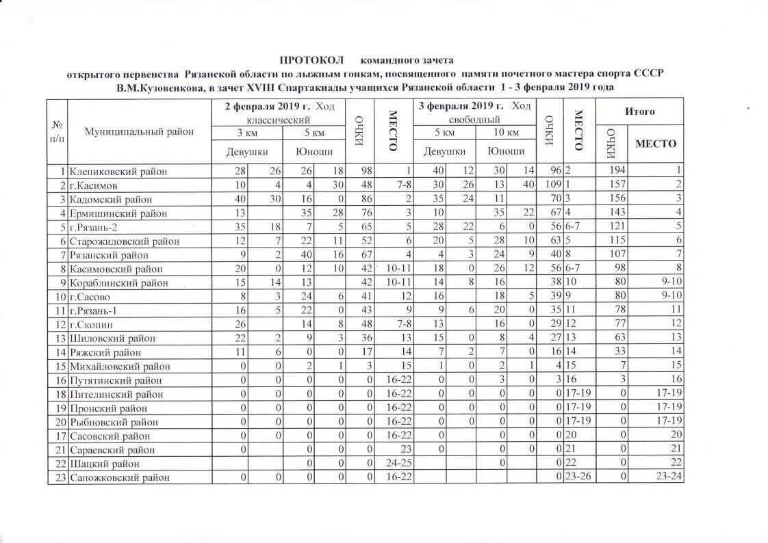 По итогам соревнований в командном зачете победу одержала команда Клепиковского района (194 очка), второе место у команды г. Касимов (157 очков) и третье место заняла команда Кадомского района (156 очков).