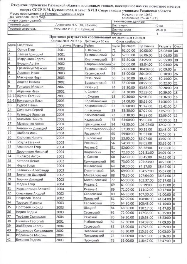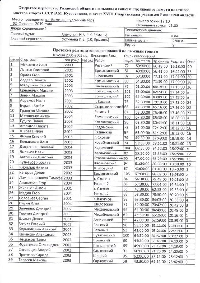 02 февраля участники соревновались классическим стилем на дистанциях: 3 км - девушки и 5 км –юноши. По итогам первого дня победителями и призёрами в личном зачете среди девушек стали: Осминникова Анастасия (Кадомский район), Лаврёнова Дарья (г. Рязань – 2), Богданова Дарья (Кадомский район), среди юношей: Макиенко Илья (Рязанский район), Лаптев Григорий (Ермишинский район), Орлов Егор (г.Касимов).
