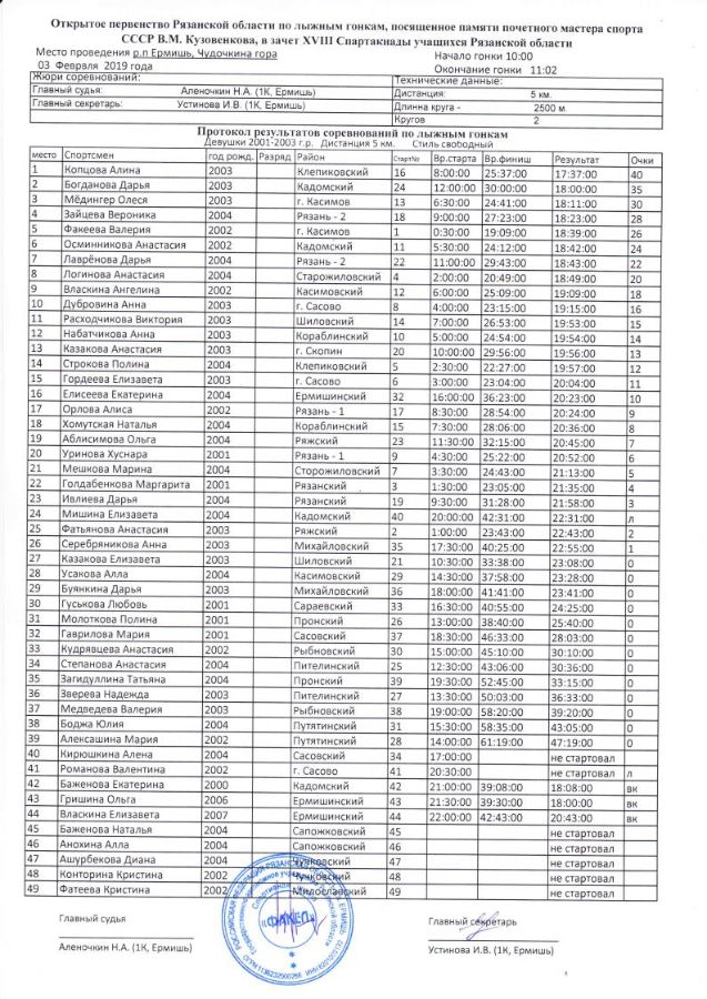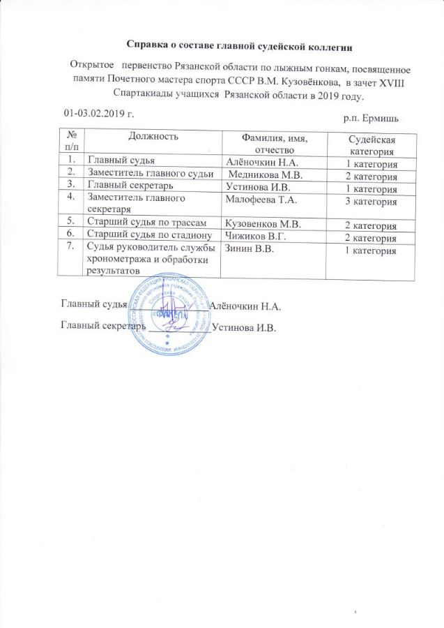 В соответствии с приказом Министерства физической культуры и спорта Рязанской области № 16 от 11.01.2019 г о проведении открытого первенства Рязанской области по лыжным гонкам, посвященного памяти Почетного мастера спорта СССР В.М. Кузовенкова, в зачет XVIII Спартакиады учащихся Рязанской области в 2019 году 01-03 февраля 2019 года в ГАУ РО «СШ «Факел» р.п. Ермишь, Рязанской области, в рамках выполнения Государственного задания, состоялись областные соревнования по лыжным гонкам. Общее руководство подготовкой и проведением мероприятия осуществляло министерство физической культуры и спорта Рязанской области. Ответственный за организацию и проведение соревнования - директор ГАУ РО «СШ «Факел» Николай Николаевич Чаруйский. Главный судья соревнований Алёночкин Николай Алексеевич (судья I категории).