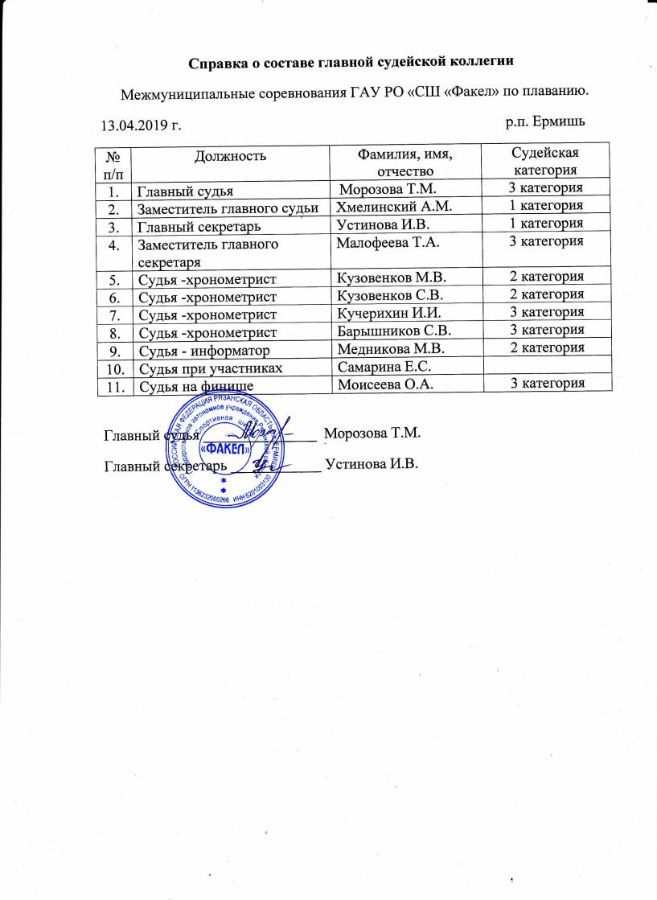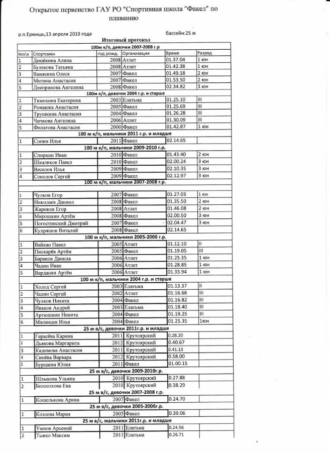 13 апреля 2019 года в СШ «Факел» прошли межмуниципальные соревнования по плаванию, в которых приняли участие спортсмены из Ермишинского района спортивной школы «Факел», Касимовского района спортивной школы «Елатьма» и команда филиала ООО «Газпром ПХГ» «Касимовское» УПХГ посёлка Крутоярский и Шацкого района спортивной школы «Атлет».