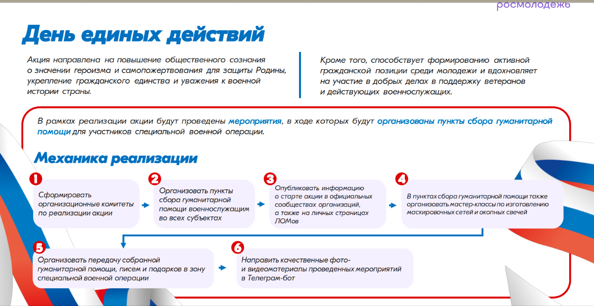 Подобные мероприятия направлены на повышение общественного сознания о значении героизма и самопожертвования для защиты Родины, укрепление гражданского единства и уважения к военной истории страны и способствуют формированию активной гражданской позиции среди молодежи, а также вдохновляют на участие в добрых делах в поддержку ветеранов и действующих военнослужащих.